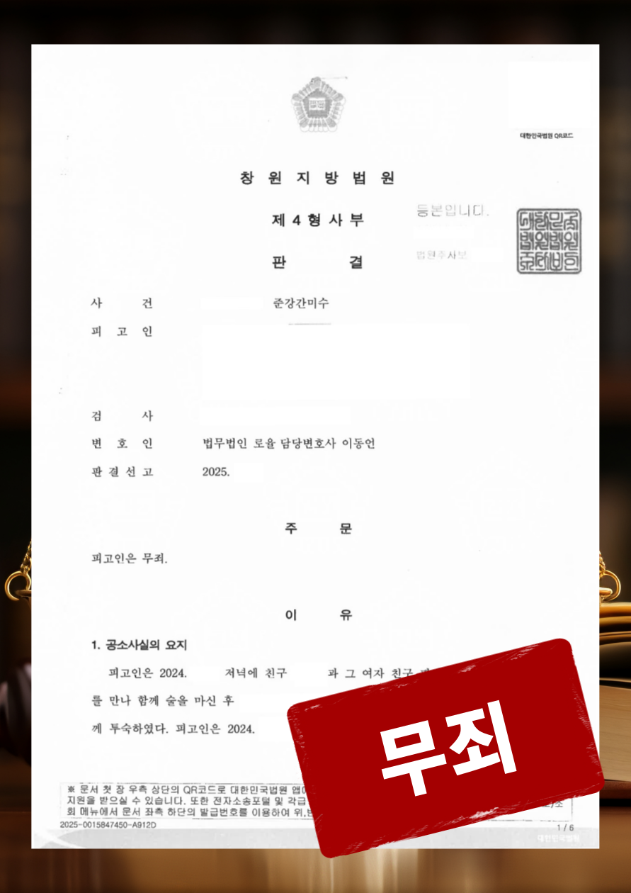 법무법인 로율의 이동언 대표번호사는 사건을 맡게된 후 당시 정황을 면밀히 분석하였고, DNA 결과 등 증거를 수집하여 사건 당시 상대방이 술에 취하긴 했으나 명백히 의식이 있는 상태였고, 관계를 할 의사를 보였기에 이 사건은 범죄에 해당하지 않는다는 점을 강조하여 준강간미수 혐의에 대한 무죄를 주장하였습니다.