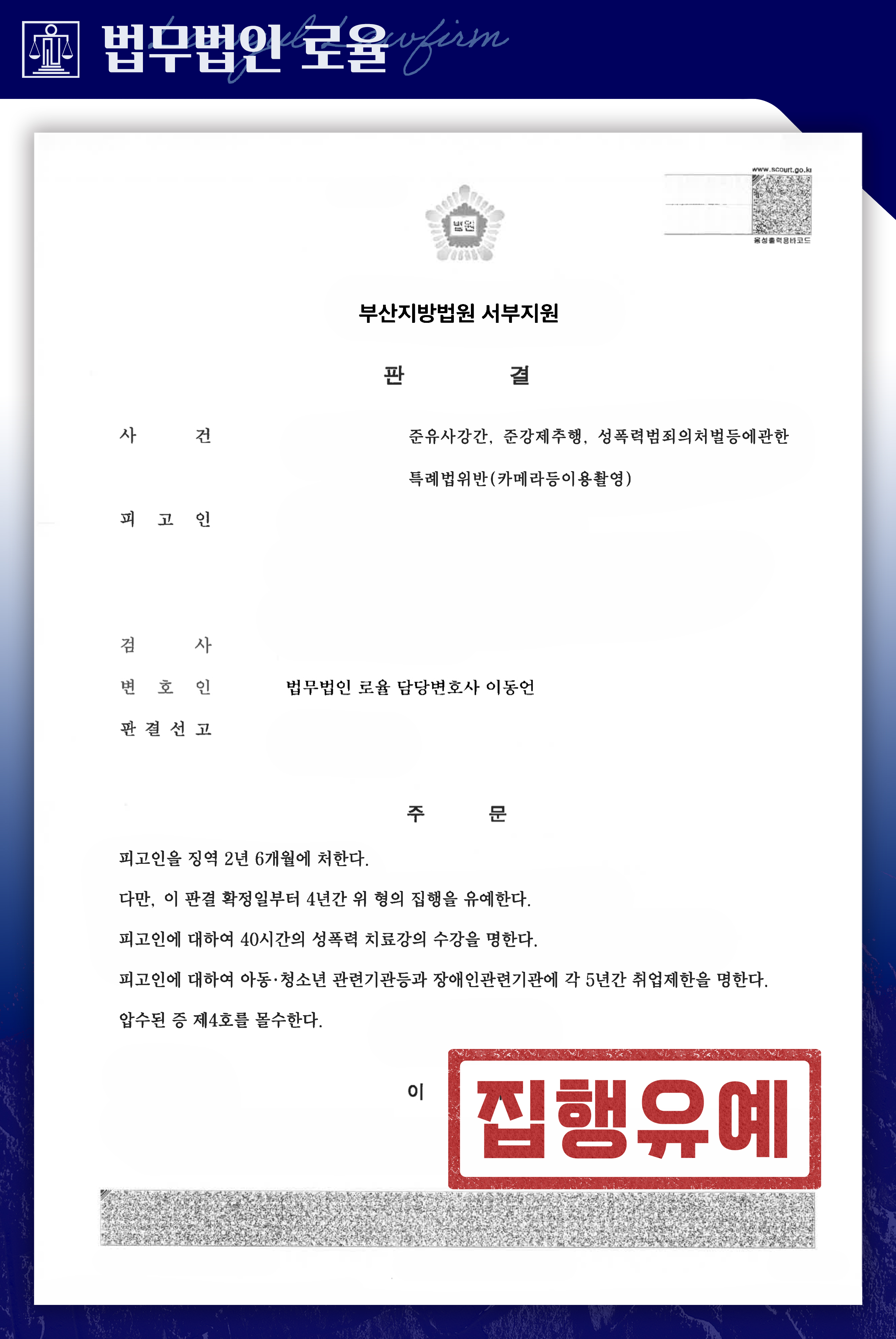 법원은 의뢰인에게 징역 2년 6개월을 선고하면서도 집행유예 4년을 부여하였습니다. 이는 다수 피해자를 상대로 한 범행과 카메라등이용촬영이 결합된 중대한 사건임에도 불구하고 실형을 면한 결과로서 중요한 의미를 가집니다. 특히 불리한 양형 요소가 다수 존재하는 상황에서 형사로펌과 형사법률사무소의 전략적 대응을 통해 결과를 이끌어낸 점이 핵심입니다. 본 사례는 부산성범죄전문변호사, 부산성추행변호사로서 이동언 대표변호사가 사건 전반을 직접 수행하여 의뢰인에게 유리한 판결을 이끌어낸 대표적인 성공사례라 할 수 있습니다.