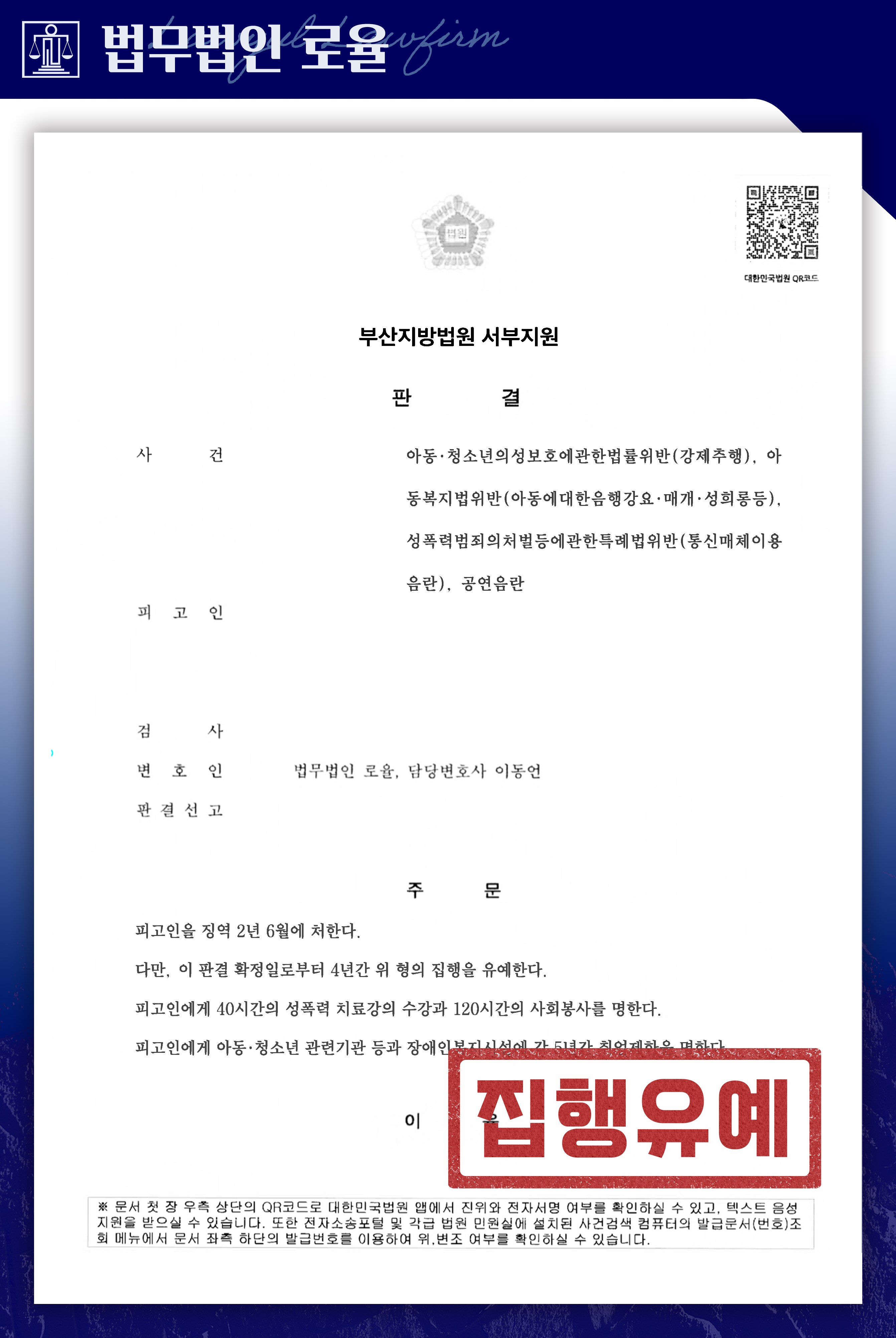 법원은 본 사건이 중대한 아청법위반 및 미성년자성범죄에 해당한다고 판단하면서도, 피해자 측과의 합의 및 처벌불원의사, 의뢰인이 초범인 점 등을 종합적으로 고려하여 징역형의 집행유예를 선고하였습니다. 이는 실형 가능성이 높은 사건에서 의미 있는 결과를 도출한 것으로, 초기 단계에서 부산아청법변호사 및 청소년성범죄변호사의 조력을 받아 체계적으로 대응하는 것이 얼마나 중요한지를 보여주는 사례라 할 것입니다.