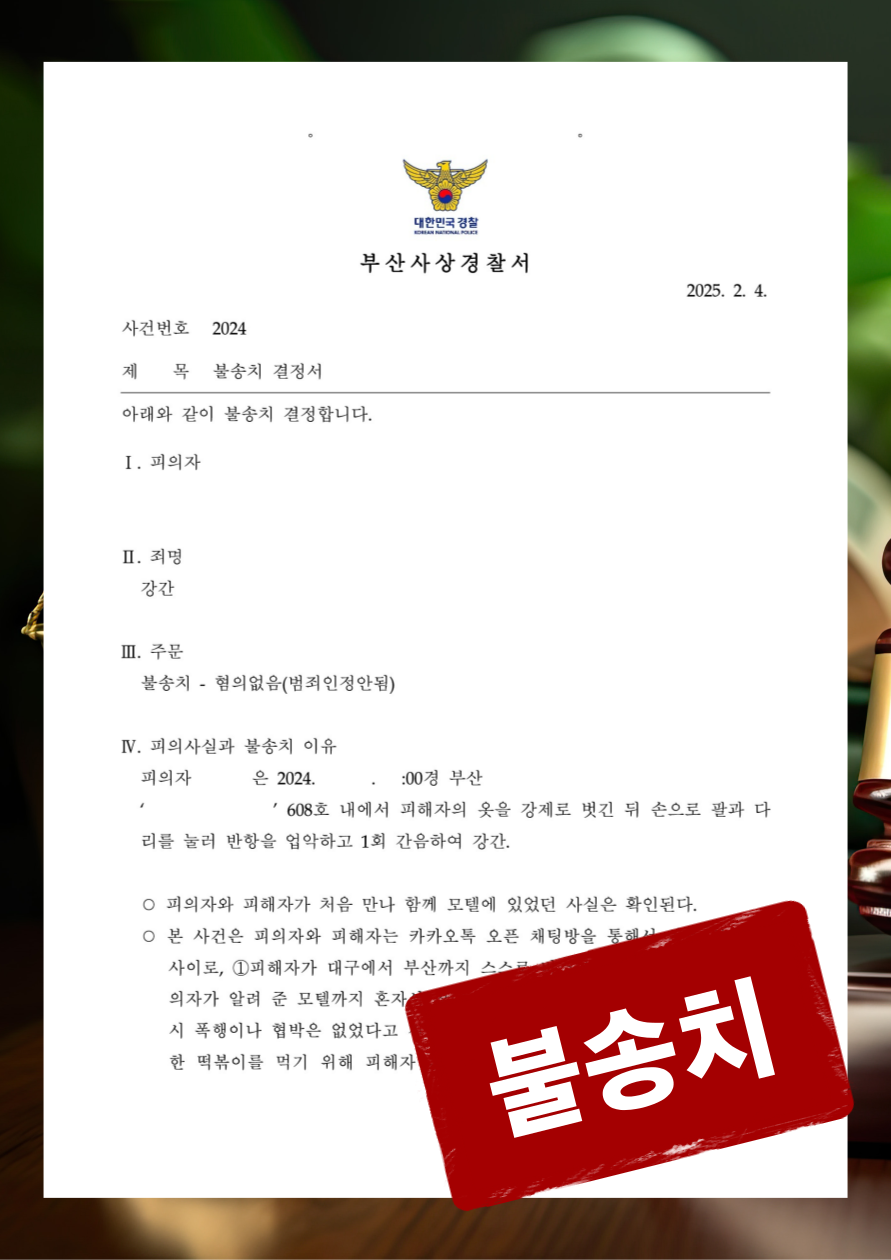 본 사건은 합의 하에 성관계를 가졌음에도 억울하게 강간으로 고소당한 사건으로, 법무법인 로율의 치밀한 사건 검토와 법률 조력으로 경찰 단계에서 불송치로 사건을 종결하여 원만히 마무리하는데 결정적인 역할을 하였습니다.