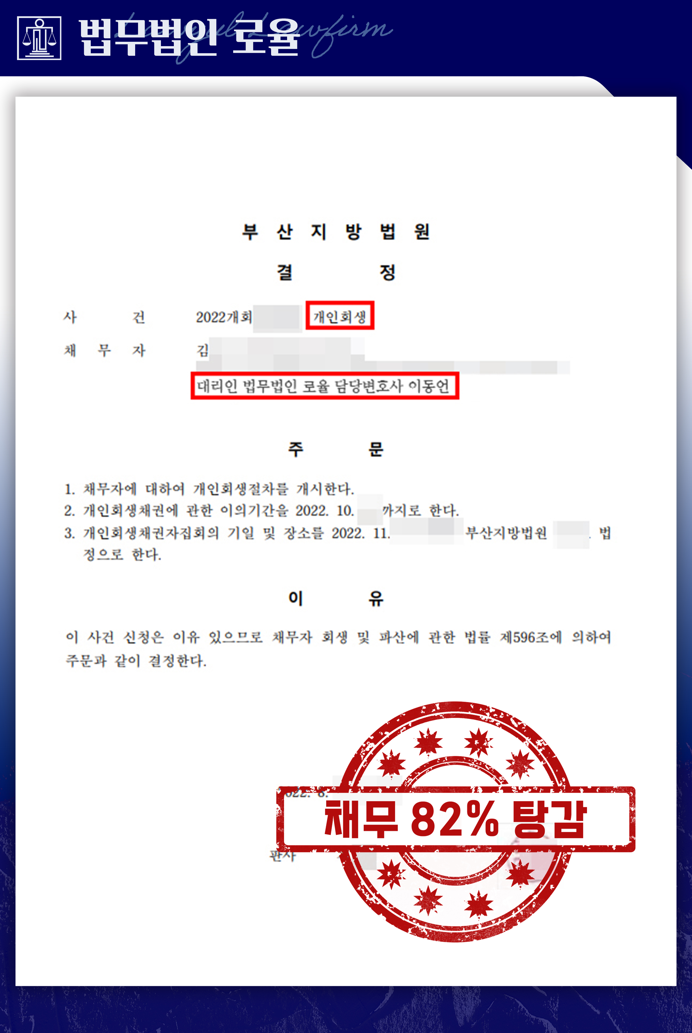 의뢰인은 이러한 상황에서 개인파산과 개인회생 중 어떤 절차를 선택해야 할지 고민하게 되었고, 개인회생전문 상담을 통해 현실적인 해결 방안을 모색하고자 하였습니다. 다양한 개인회생잘하는곳 및 부산개인회생상담 사례를 비교·검토한 결과, 안정적인 소득이 있는 점을 고려할 때 개인회생 절차가 보다 적합하다는 판단에 이르렀고, 이에 개인회생법무법인인 법무법인 로율에 상담을 의뢰하게 되었습니다.
