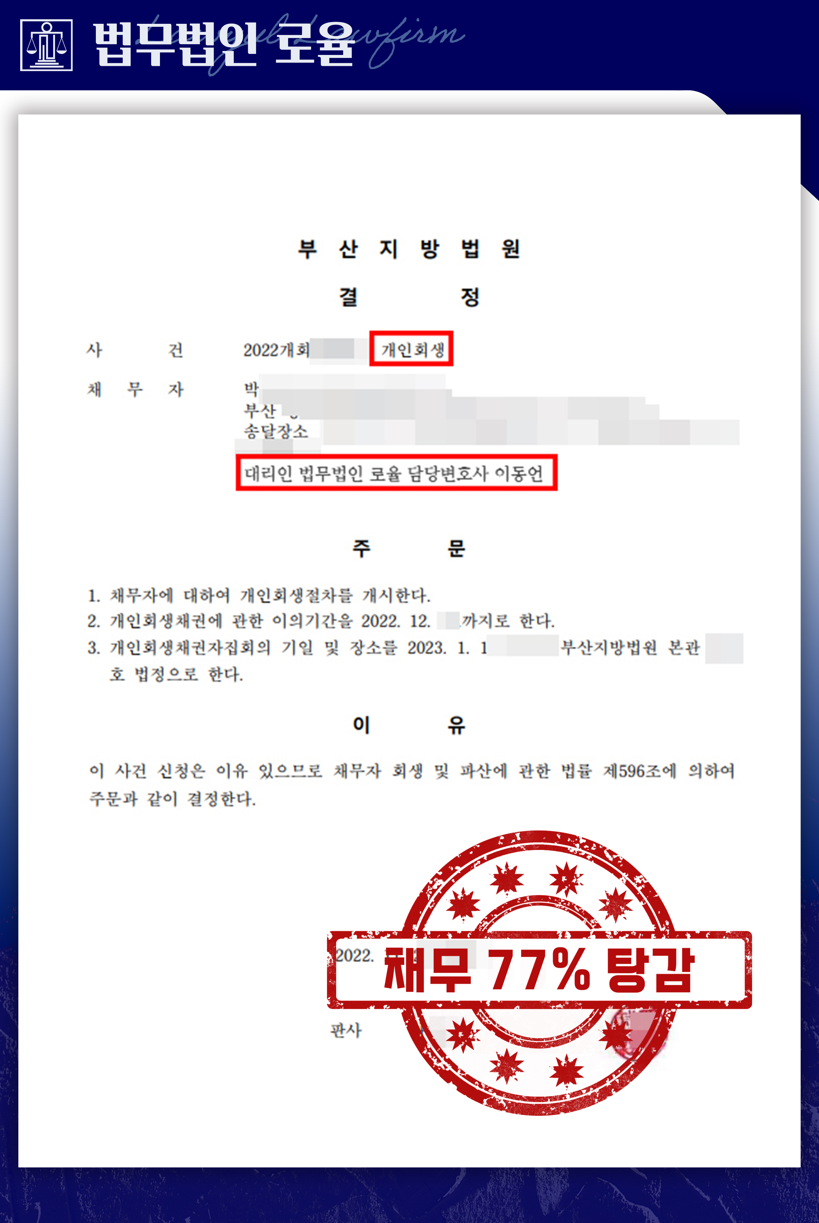 그 결과, 총 채무 1억 3천만 원 중 약 77%가 탕감되어 약 3천만 원만을 변제하는 내용으로 인가결정을 받을 수 있었으며, 의뢰인은 개인회생절차를 통해 과도한 채무 부담에서 벗어나 안정적인 경제생활을 이어갈 수 있는 기반을 마련하게 되었습니다.